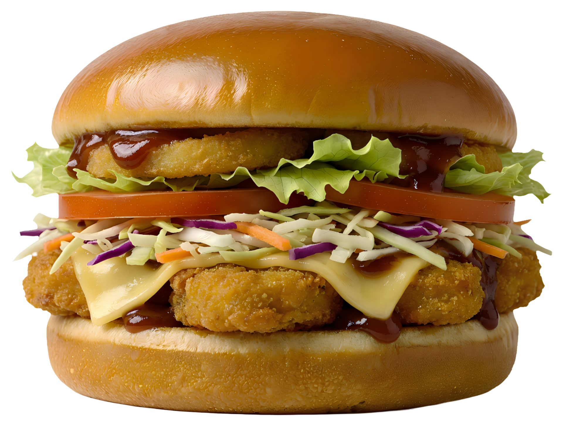 Ψωμάκι brioche με meatless nuggets, τυρί vegan, dry slaw (λάχανο άσπρο & κόκκινο & καρότο), ντομάτα, iceberg, onion ring & American BBQ sauce